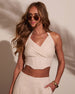Flirty, fresh, and undeniably elevated the Melanie Linen Corset Top is where elegance meets effortless edge. Designed in breathable linen with a pleated surplice bust and halter neck tie, this top brings a flattering, sun-kissed silhouette with a soft twist of romance. The boned bodice gives structure without feeling stiff, while the smocked back panel keeps things comfy and perfectly fitted. Pair it with the matching Melanie Wide Leg Linen Pants for a chic set that screams summertime fine.