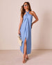 The Waveswept Halter Neck Maxi Dress is made for sun-drenched escapes and seaside soirées. With its breezy lightweight linen and a subtle sheen that catches the light just right, this dress moves like a warm ocean breeze. The crisscross halter neckline ties at the back for a just-right fit, while the pleated front adds a touch of flowy elegance.